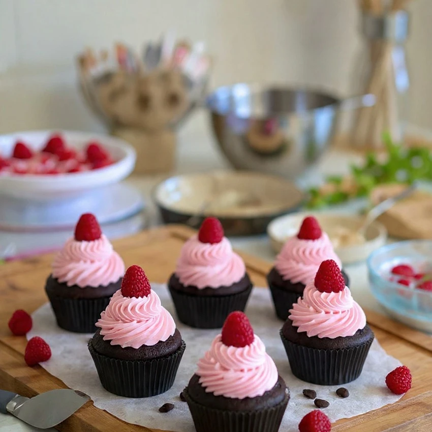 A tray of chocolate cupcakes cooling on the counter has a way of filling the whole kitchen with warmth. Add raspberries to the mix, and the aroma becomes even more inviting. The combination of deep chocolate and bright berries feels both comforting and a little special at the same time.