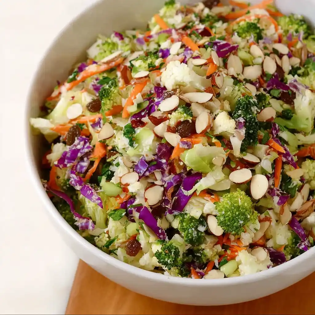 Crunchy Detox Salad is packed with texture. Finely chopped cauliflower and broccoli create the base. Red cabbage and carrots add color and sweetness. Fresh parsley brightens everything. Almonds and sunflower seeds bring crunch, while raisins offer small bursts of natural sweetness.