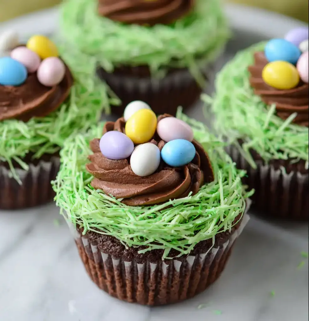 These cupcakes look like tiny bird nests sitting on top of rich chocolate cake. Green coconut forms soft “grass,” chocolate frosting becomes the nest, and a few candy eggs finish everything with a cheerful touch. They bring a little bit of fun to the dessert table without asking for complicated baking skills.