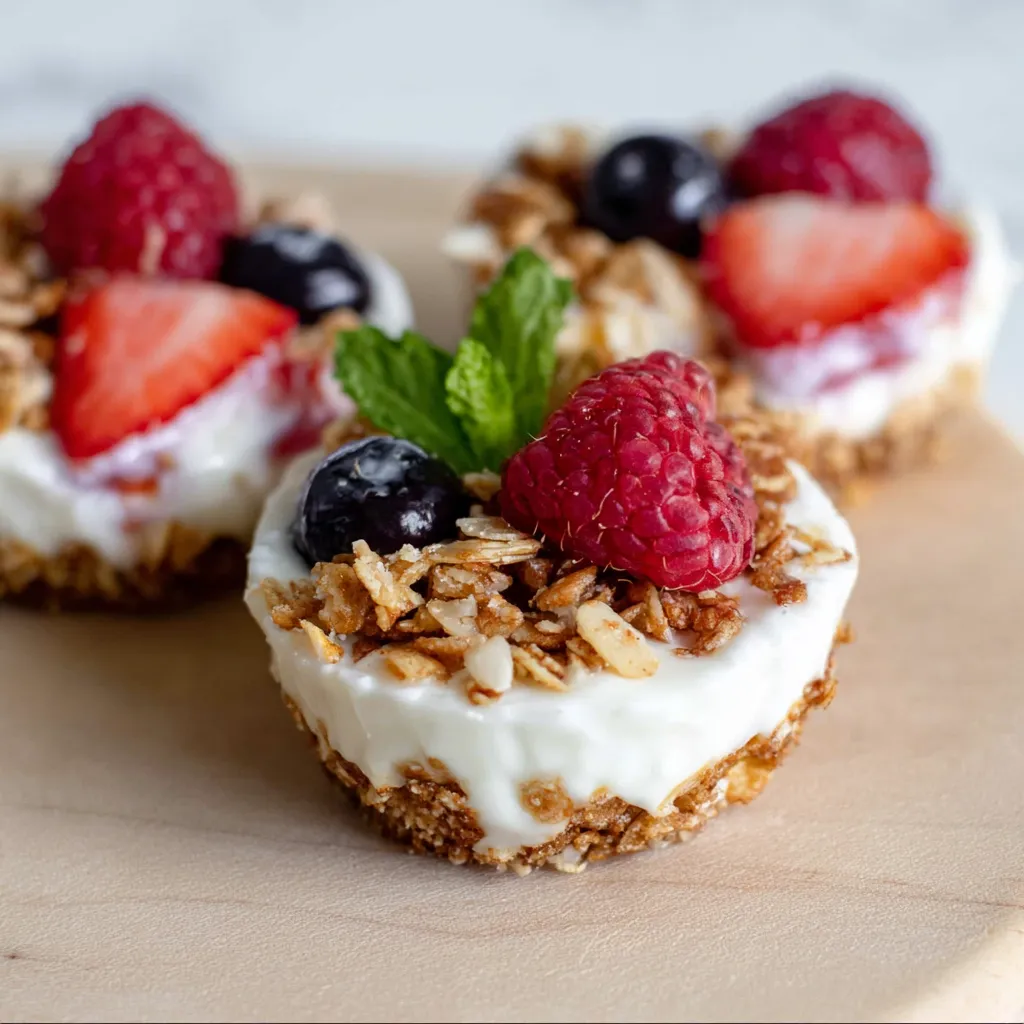 The first batch came together in minutes. I pressed a sticky oat mixture into muffin liners, topped it with creamy yogurt, and finished it off with fresh berries. Once frozen, they turned into the perfect cold snack. Crunchy on the bottom, creamy in the middle, and fruity on top.
