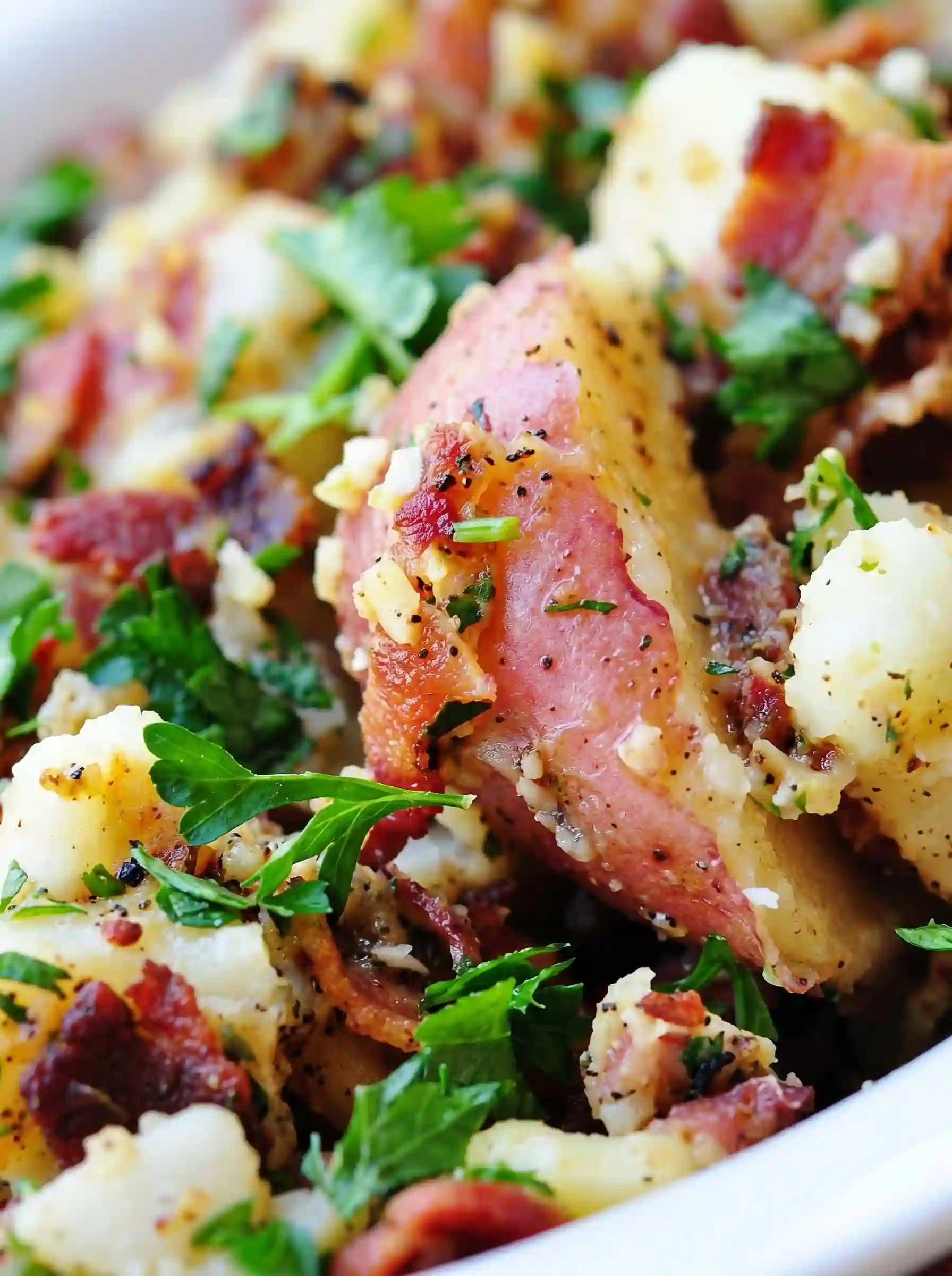 - Remove the pot from the heat and toss in the sliced potatoes, gently mixing until potatoes have absorbed all of the liquid. Carefully fold in the cooked bacon pieces and chopped parsley.