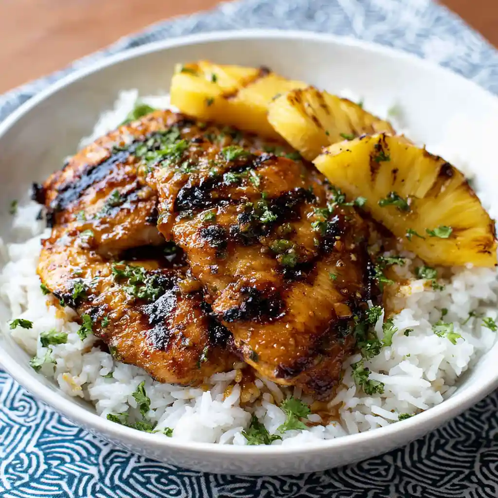 The first time I made this, the smell of pineapple and garlic filled the kitchen, and I knew it was going to be a hit. The chicken came off the grill golden and juicy, the rice soft and fragrant from the coconut milk. Every bite was a mix of sweet, savory, and just the right amount of richness.
