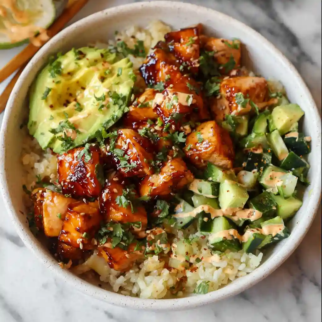 This Honey Glazed Salmon Bowl Recipe works best when everything is still slightly warm, with the cool cucumber mixture layered on top. The contrast in temperature makes each bite more interesting.