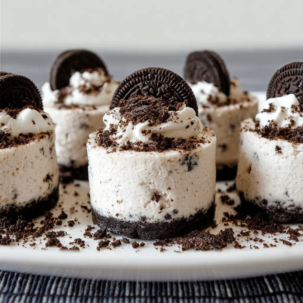 Creamy, chilled, and full of cookies-and-cream flavor, these mini no-bake Oreo cheesecakes are perfect for when you want a rich dessert without turning on the oven. Each one is layered with a chocolate cookie crust and a smooth cheesecake filling — all topped with a swirl of cream and extra Oreo crunch.