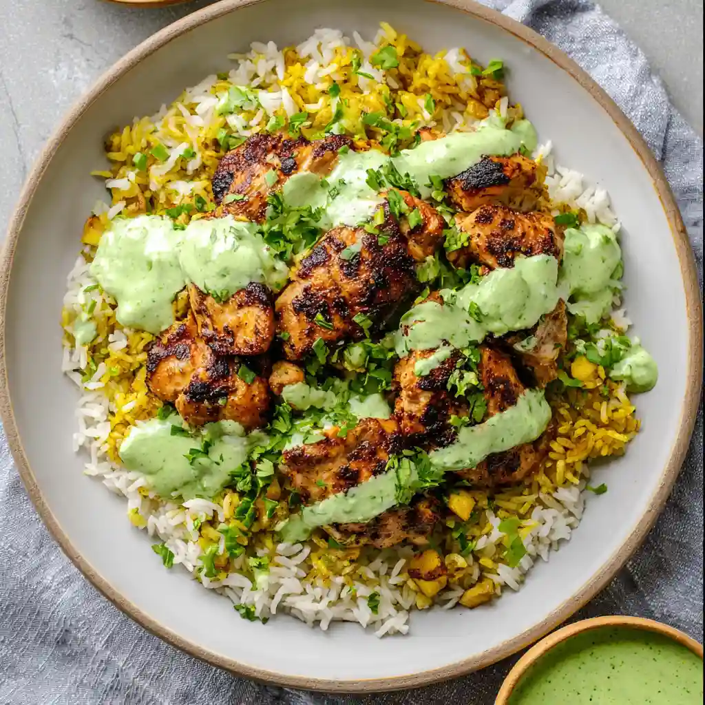The first time I tried this dish, it wasn’t at a fancy restaurant or from a takeout box. A friend invited me over and said, “You have to try this green sauce.” That was the only warning I got. The chicken was grilled, the rice was golden, and there was a small jar of something green sitting next to the plate.