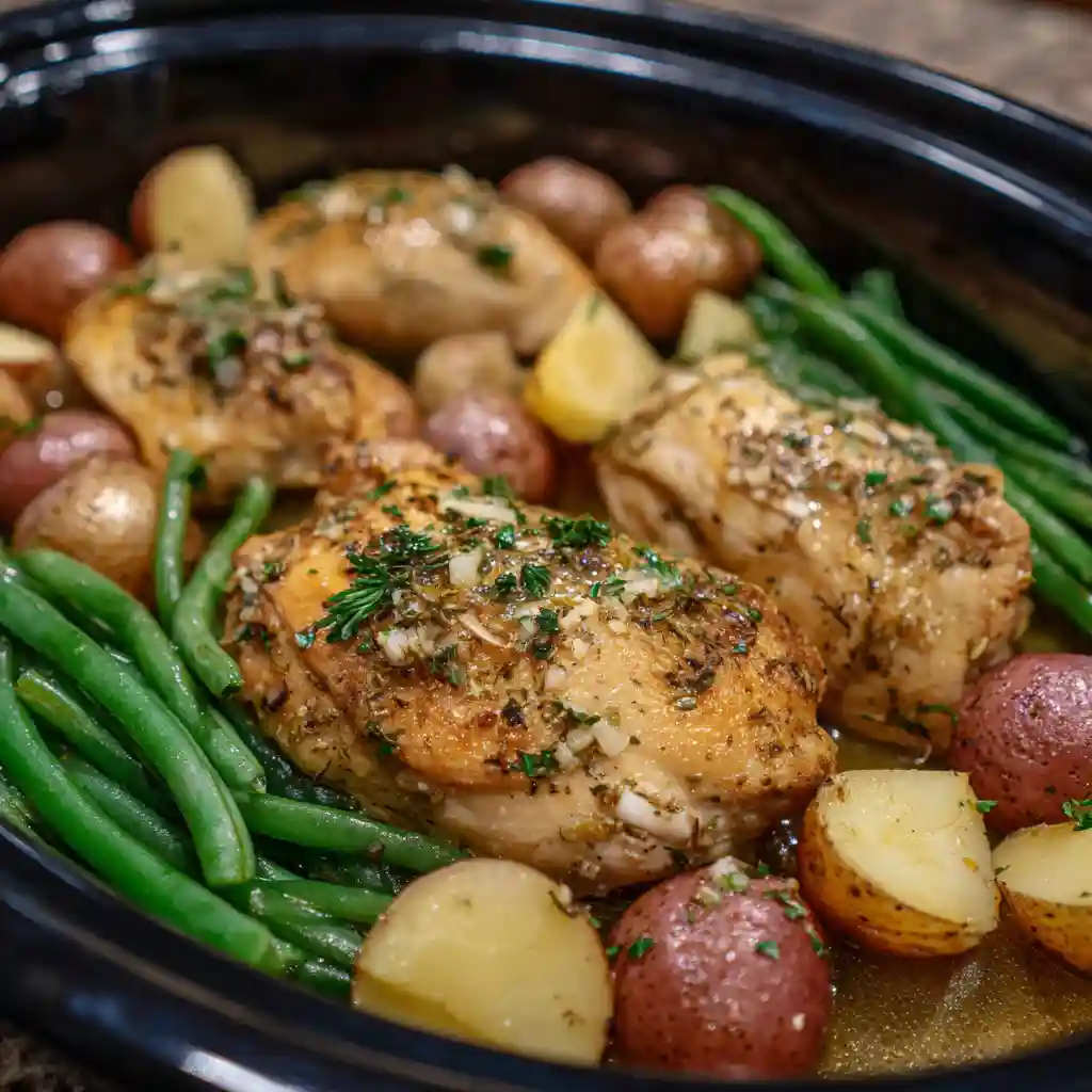 You layer everything in, close the lid, and let time do its thing. A few hours later, the kitchen smells like garlic and butter. The chicken turns tender enough to cut with a fork. The potatoes soak up all that flavor. It feels like you planned ahead, even if you barely did.