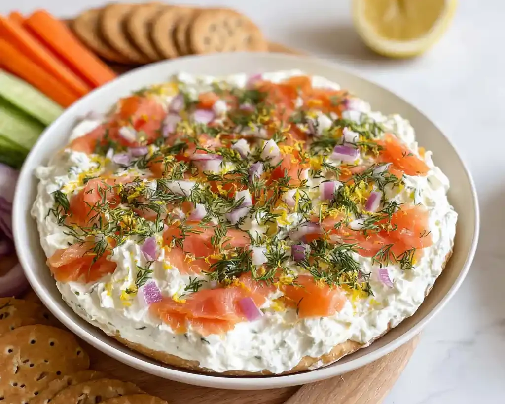 Smoked salmon bagel dip feels especially at home at brunch tables and casual gatherings. The creamy base and colorful toppings create a platter that looks inviting without much effort.
