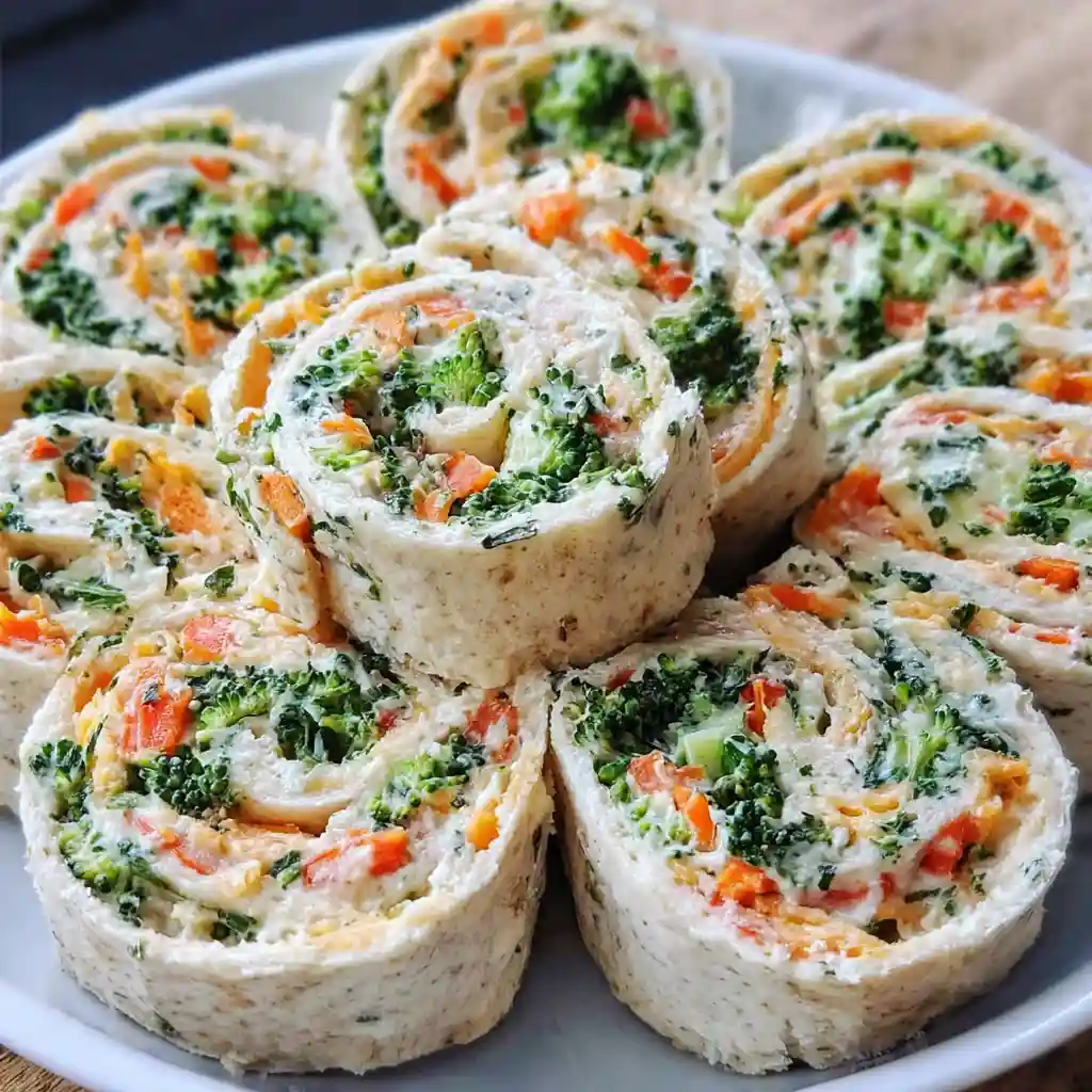 Chop the broccoli and carrots as small as you can. Smaller pieces make the pinwheels easier to roll and slice cleanly. When spreading the filling, take a moment to reach all the way to the edges—this helps the roll stay together without gaps.